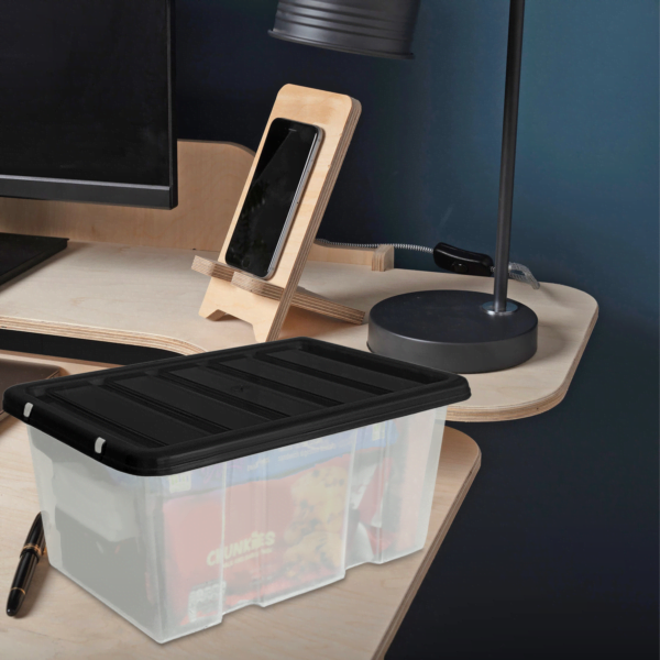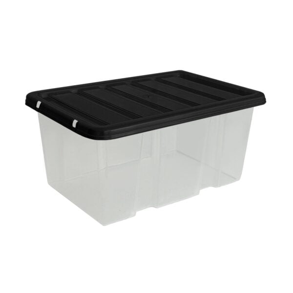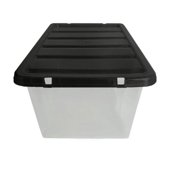 Crafted from high-quality plastic, this storage box is lightweight, durable, and equipped with a sleek black lid. The black lid provides a stylish contrast to the clear base, adding a touch of sophistication to your storage space while ensuring that your belongings remain securely contained.